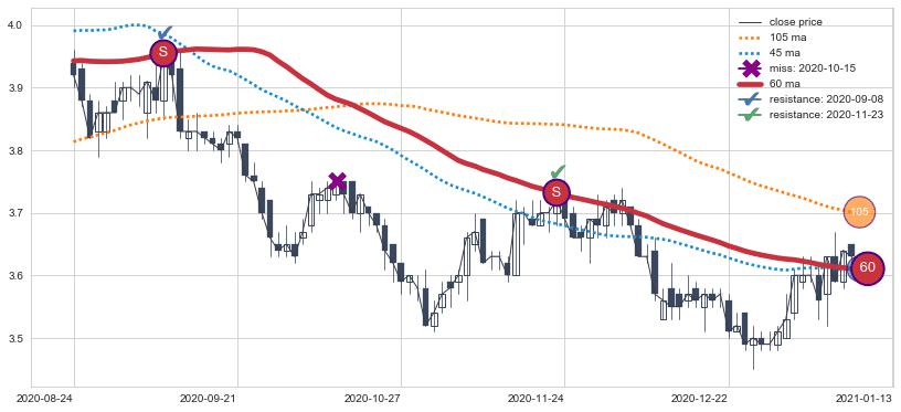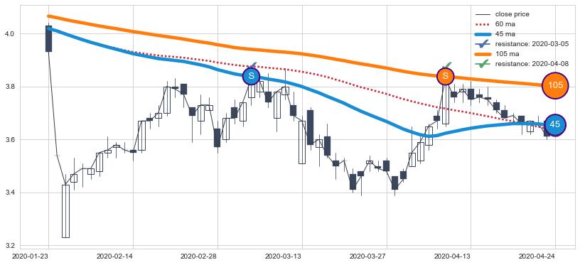 下跌趋势2020-01-23-2020-04-24,均线105, 45确认关键阻力2处