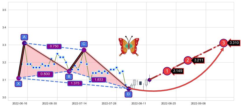 ➣ 已完成【蝴蝶】形态起点X: 2022-06-13, 终点D: 2022-08-03, 共38交易日