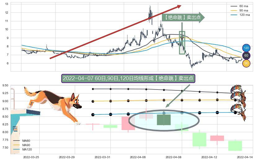 ⚄ 破位点后很长一段走势后才出现ma下垂点:2022-04-11-日,涨势转换跌势迟疑犹豫,信号【可信度低】