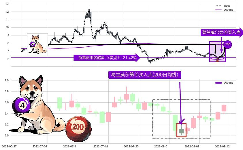 形态多维评估: ⚀ 2022-08-03-日显现 葛兰威尔均线 200日均线 第④买入点 下降趋势均值回复的短线反弹信号,后市看涨,买进信号