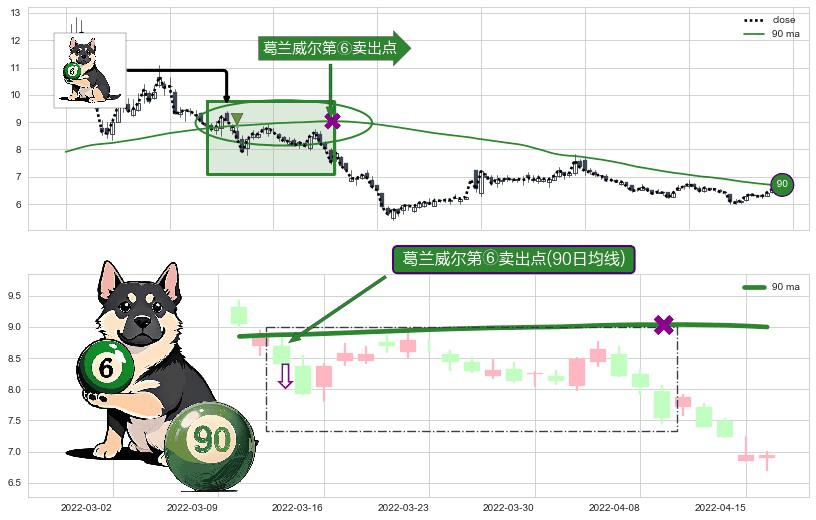 形态多维评估: ⚀ 2022-03-14-日显现 葛兰威尔均线 90日均线 第⑥卖出点 走势反转见顶信号,后市看跌,卖出信号