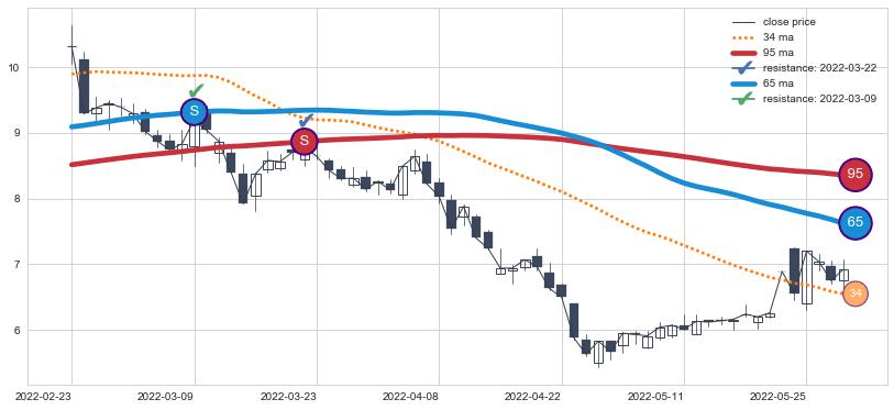 下跌趋势2022-02-23-2022-05-30,均线65, 95确认关键阻力2处