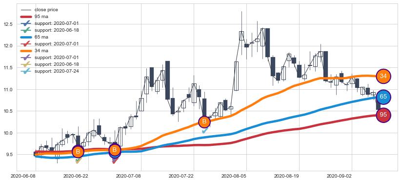 上涨趋势2020-06-08-2020-09-09,均线65, 34, 95确认关键支撑3处