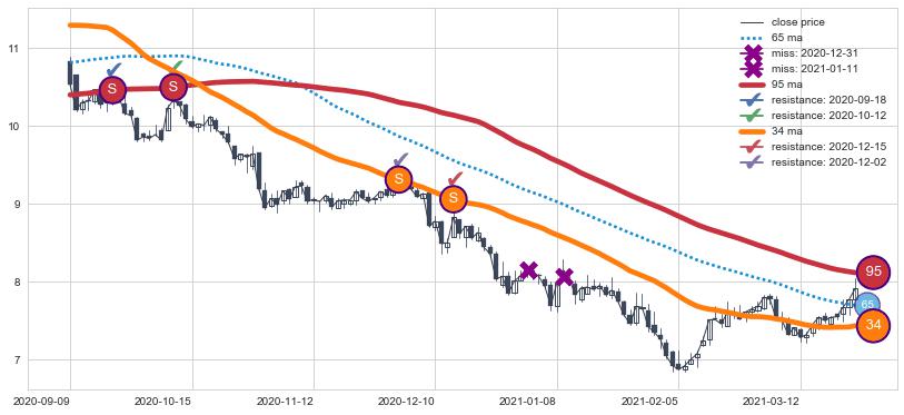 下跌趋势2020-09-09-2021-03-25,均线34, 95确认关键阻力4处