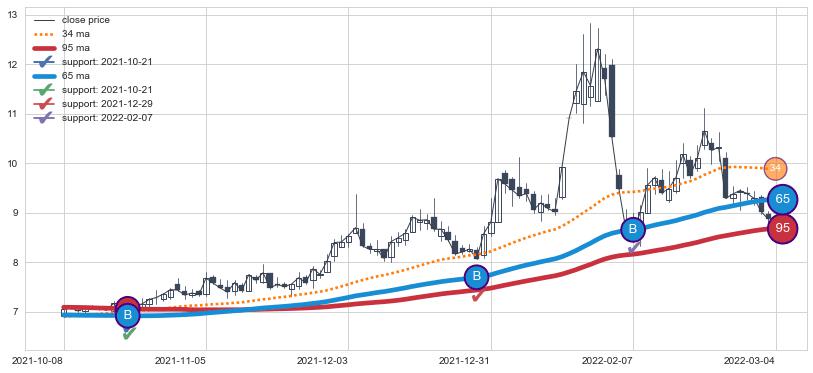 上涨趋势2021-10-08-2022-03-04,均线65, 95确认关键支撑3处