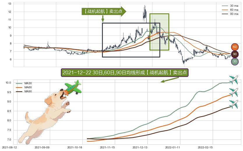 形态多维评估: ⚀ 2021-10-21日-2022-03-02日显现 30日-60日-90日均线 【战机起航】卖出点 看空信号,后市看跌,卖出