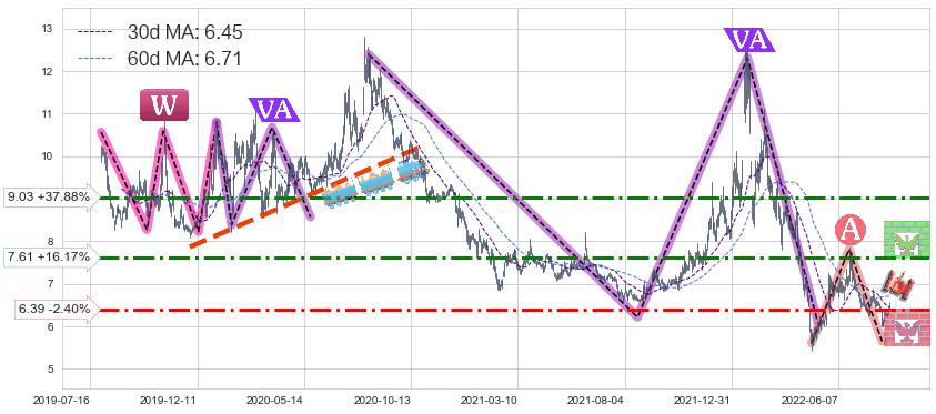 ♘ 阻力价格位7.61,可信任强度69.76%,距离最后交易2022-08-12形成的收盘价格6.55相差 +16.17%