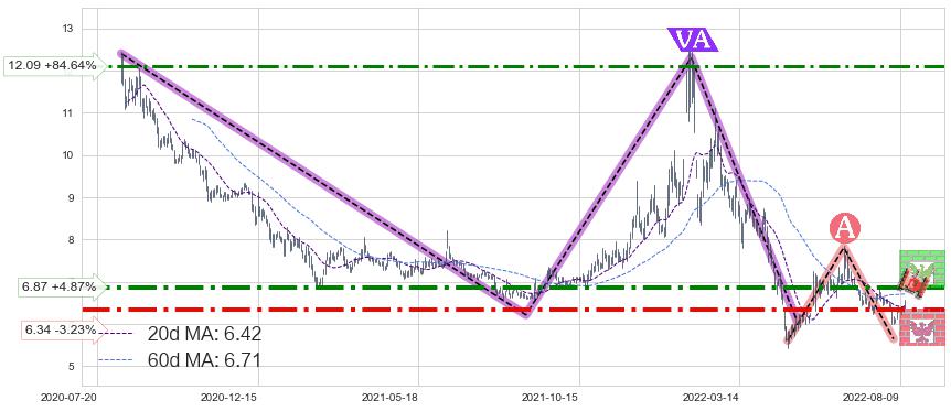 ♘ 阻力价格位6.87,可信任强度76.90%,距离最后交易2022-08-12形成的收盘价格6.55相差 +4.87%