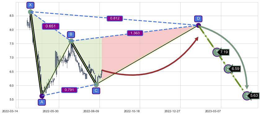 ➣ D点拟合预测价格8.15,距离最后交易收盘价格6.55相差 +24.46%