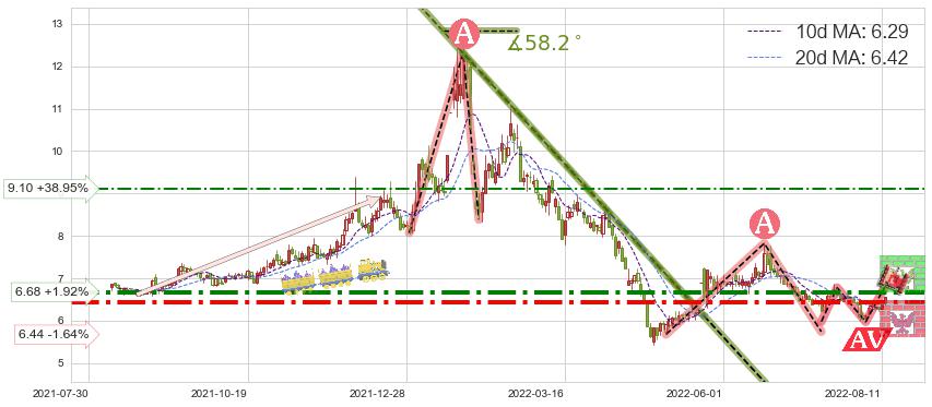♘ 阻力价格位9.10,可信任强度53.67%,距离最后交易2022-08-12形成的收盘价格6.55相差 +38.95%