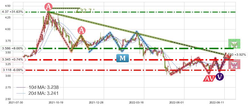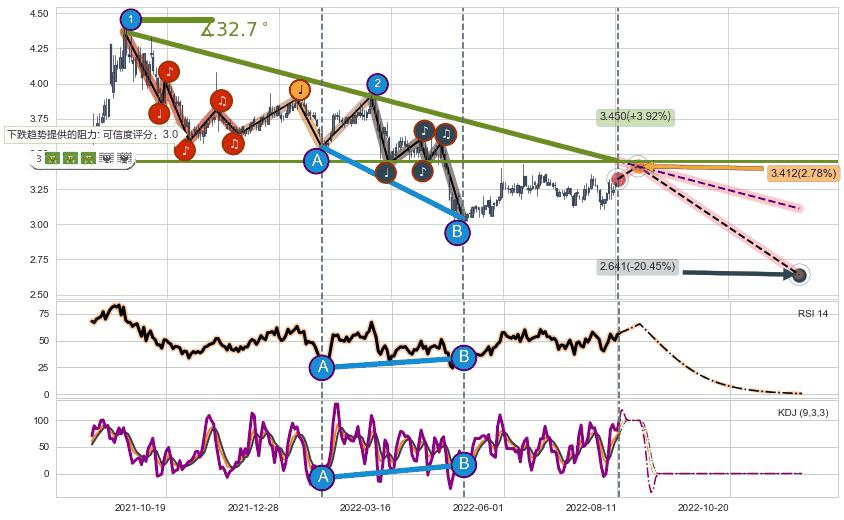 ♘ 阻力价格位3.586,可信任强度92.32%,距离最后交易2022-08-12形成的收盘价格3.320相差 +8.00%