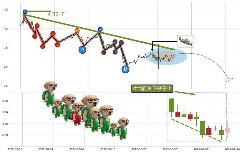 ♘ 在最后的下跌阶段2021-09-13至2022-05-10,存在 持续未破位的阻力位 ,阻力价格3.450,可信任强度75.81%,其距离最后价格3.320相差 +3.92%