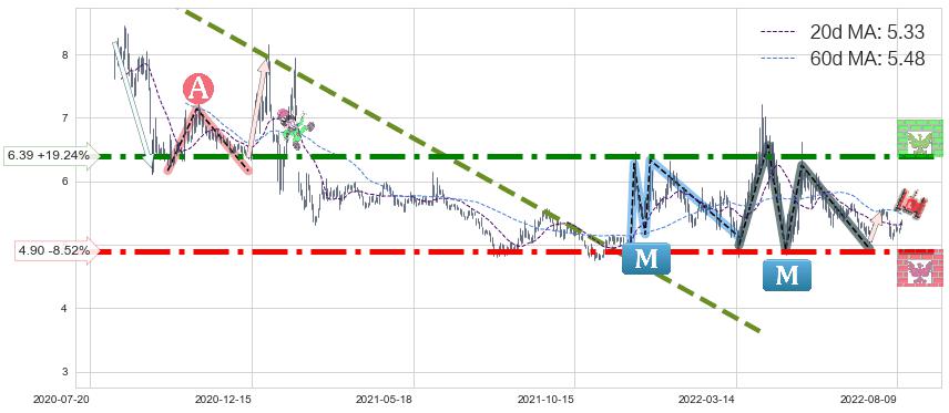 ♞ 20日均线:5.33,60日均线:5.48→ 快线<慢线
