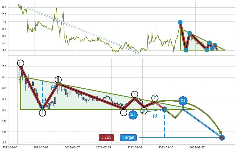 ➣ 【未确认突破,预测即将形成突破】下降三角形整理起点:2022-04-08, 预测突破点:2022-08-22,形态共93交易日