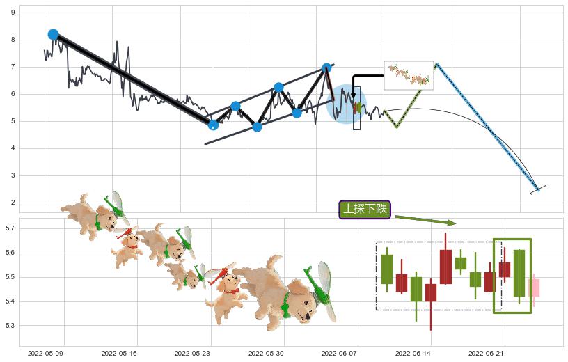 | 8 🅚:下跌身怀六甲 ➕ 📐:升旗形下行突破支撑位破位, 猜想持续下沉下跌,被突破的支撑位已变为阻力位 ☞ 看空信号 ⇥ 【🅚线】交织【图形】⇥ 综合量化分数: 46 | > |