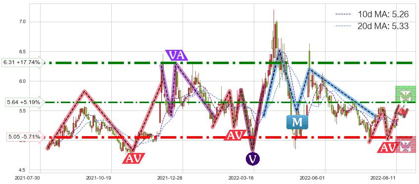 ♘ 阻力价格位5.64,可信任强度67.51%,距离最后交易2022-08-12形成的收盘价格5.36相差 +5.19%