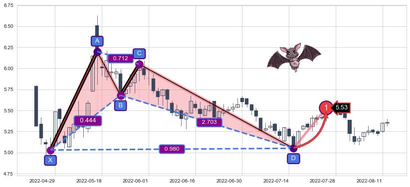 ➣ 已完成【蝙蝠】形态起点X: 2022-04-28, 终点D: 2022-07-15, 共53交易日