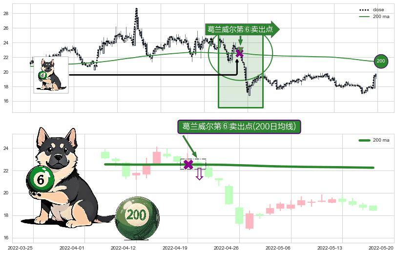 形态多维评估: ⚀ 2022-04-20-日显现 葛兰威尔均线 200日均线 第⑥卖出点 走势反转见顶信号,后市看跌,卖出信号