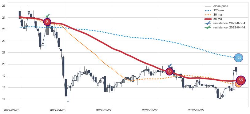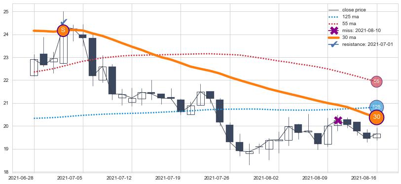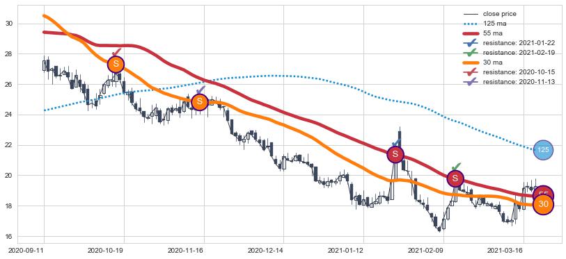 下跌趋势2020-09-11-2021-03-19,均线30, 55确认关键阻力4处