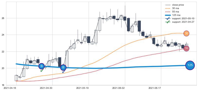 上涨趋势2021-04-16-2021-06-28,均线125确认关键支撑2处
