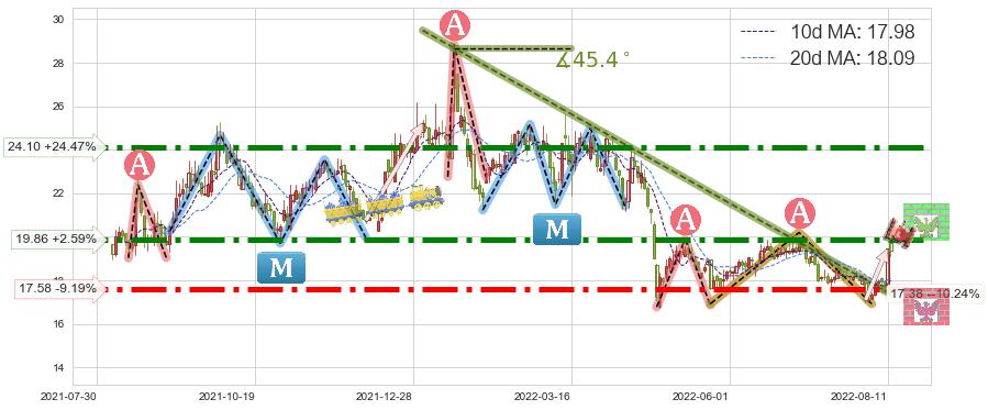 ⚔️ 2021-12-31-2022-08-10下跌趋势存在反转上涨[机会],其原下跌趋势的阻力位(17.38)已被突破[强支撑信号],原下跌趋势角度: 45.4˚