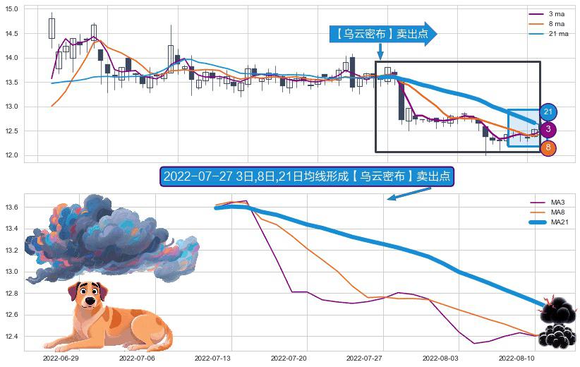 ⚀ 2022-07-12日-2022-08-11日显现 3日-8日-21日均线 【乌云密布】卖出点 看空信号,后市看跌,卖出