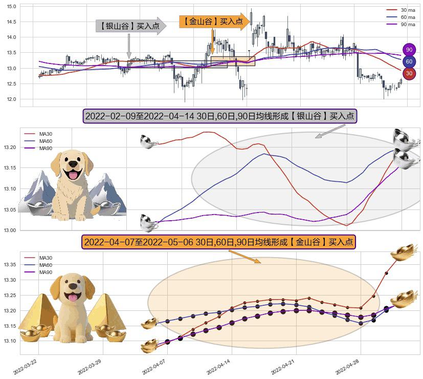⚀ 2022-04-08-日至2022-05-06-日显现 30日-60日-90日均线 【金山谷】买入点 其再次确认了买入信号,可靠性更强,买入