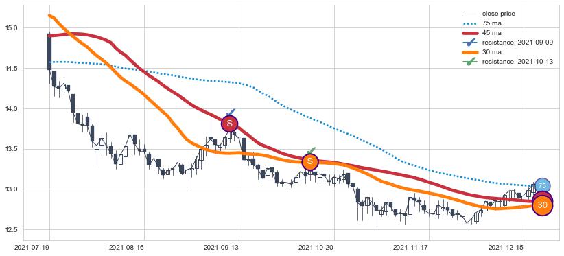 ⚂ 2022-03-31-日均线向上突破,2022-07-15-日重新下穿均线破位,均线阻力再次生效