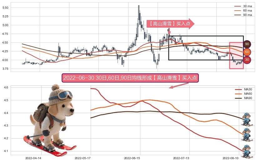 形态多维评估: ⚀ 2022-05-17日-2022-08-12日显现 30日-60日-90日均线 【高山滑雪】买入点 看多信号,后市看涨,买入