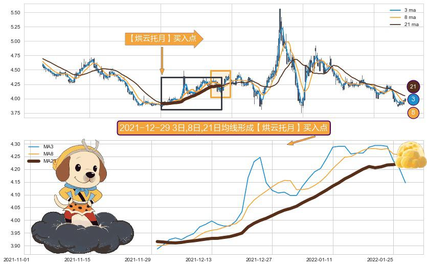 形态多维评估: ⚀ 2021-11-30日-2022-01-27日显现 3日-8日-21日均线 【烘云托月】买入点 看多信号,后市看涨,买入