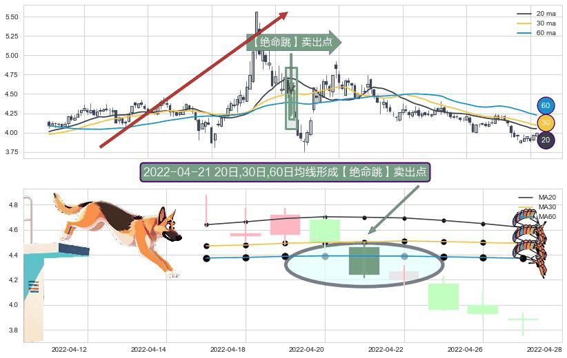 形态多维评估: ⚀ 2022-04-21日显现 20日-30日-60日均线 【绝命跳】卖出点 看空信号,后市看跌,卖出