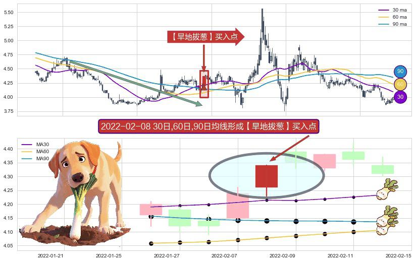 形态多维评估: ⚀ 2022-02-08日显现 30日-60日-90日均线 【旱地拔葱】买入点 看多信号,后市看涨,买入