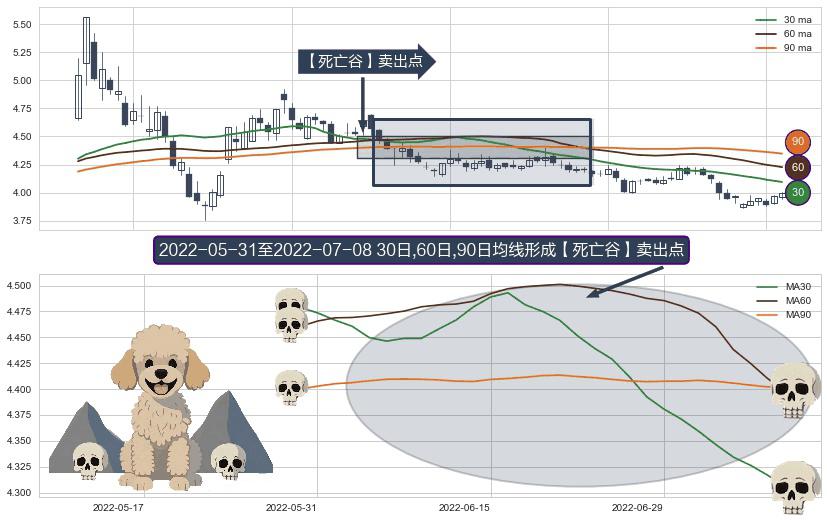⚂ 【死亡谷】卖出点 由MA30均线下穿MA60均线和MA90均线,MA60均线下穿MA90均线形成