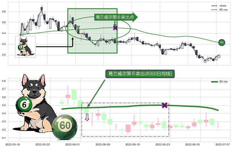 形态多维评估: ⚀ 2022-06-02-日显现 葛兰威尔均线 60日均线 第⑥卖出点 走势反转见顶信号,后市看跌,卖出信号