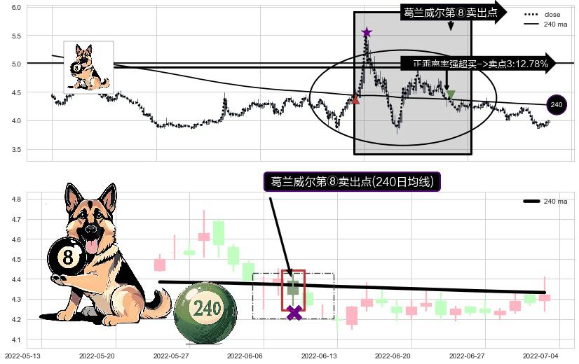 形态多维评估: ⚀ 2022-06-08-日显现 葛兰威尔均线 240日均线 第⑧卖出点 下降趋势的中继信号,后市看跌,卖出信号