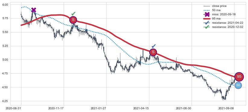 下跌趋势2020-08-31-2021-09-09,均线95确认关键阻力2处
