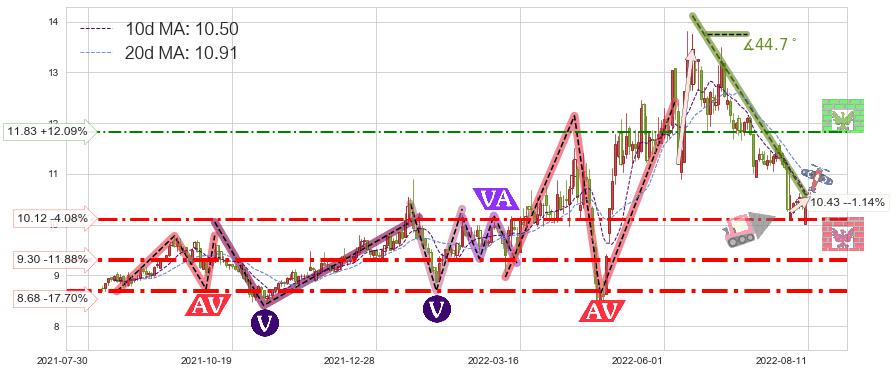 ♘ 支撑价格位10.12,可信任强度59.82%,距离最后交易2022-08-12形成的收盘价格10.55相差 -4.08%
