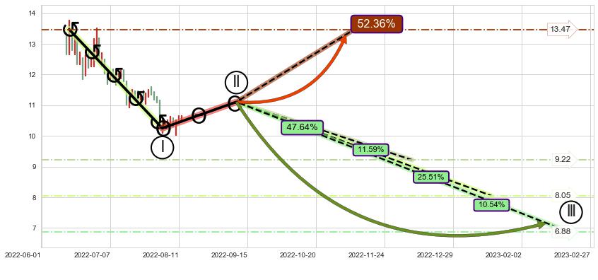 ➢ 循环浪继续向下【最低】位置(2023-02-27, 6.88),匹配聚类样本比例22.13%, 可能性概率10.54%