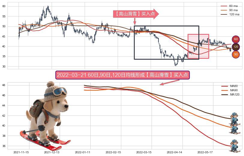 形态多维评估: ⚀ 2022-01-05日-2022-06-02日显现 60日-90日-120日均线 【高山滑雪】买入点 看多信号,后市看涨,买入