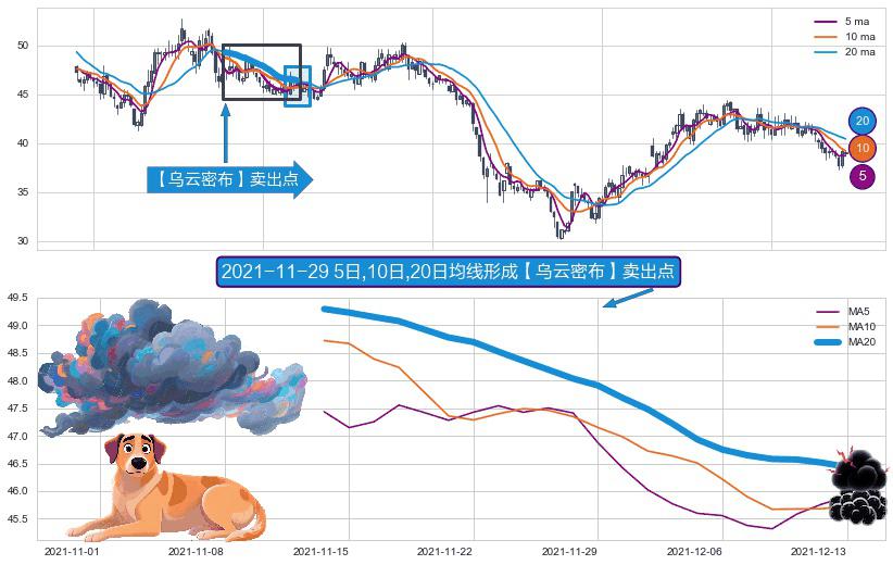 形态多维评估: ⚀ 2021-11-12日-2021-12-13日显现 5日-10日-20日均线 【乌云密布】卖出点 看空信号,后市看跌,卖出