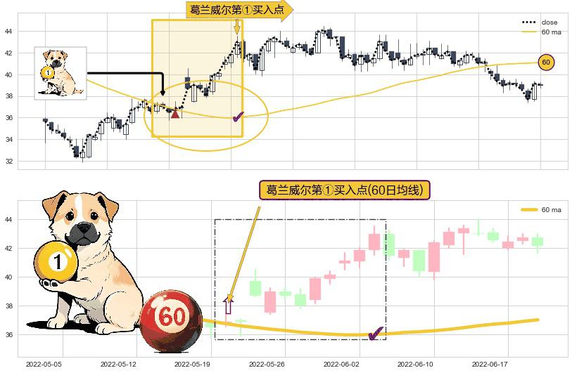 形态多维评估: ⚀ 2022-05-20-日显现 葛兰威尔均线 60日均线 第买①入点 走势反转见底信号,后市看涨,买进信号