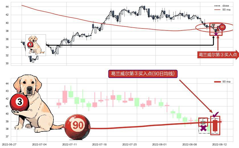 形态多维评估: ⚀ 2022-08-11-日显现 葛兰威尔均线 90日均线 第③买入点 上升趋势的中继信号,后市看涨,买进信号