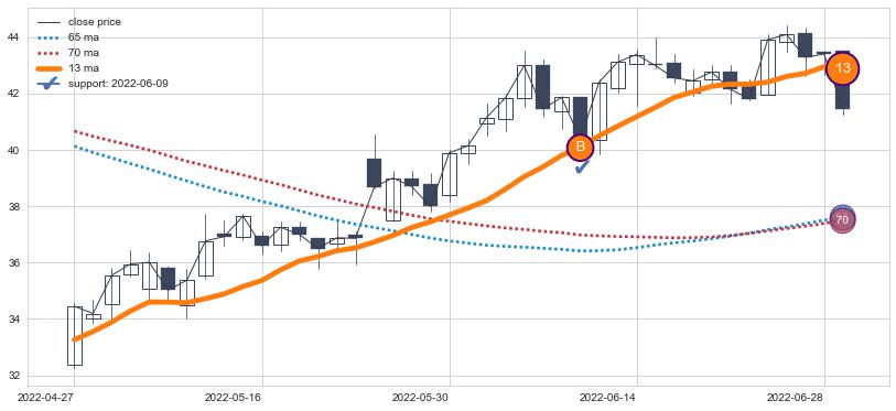 上涨趋势2022-04-27-2022-06-29,均线13确认关键支撑1处