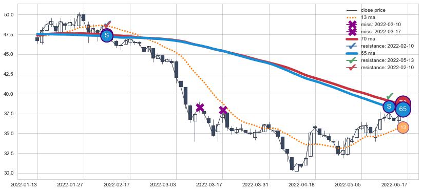 下跌趋势2022-01-13-2022-05-17,均线65, 70确认关键阻力2处