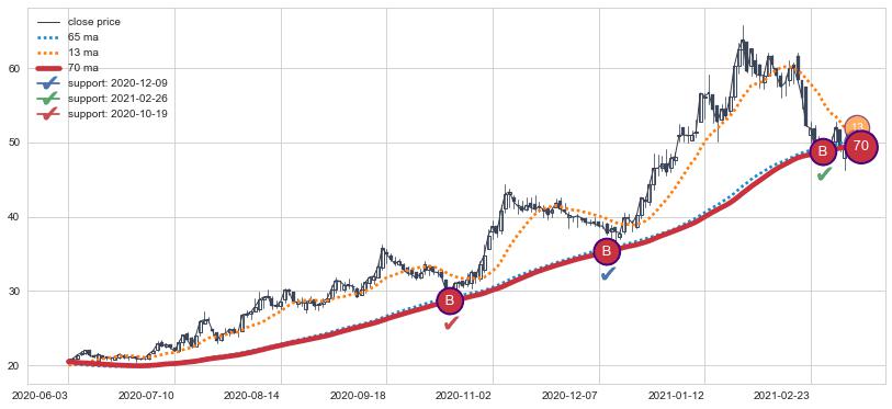 上涨趋势2020-06-03-2021-03-05,均线70确认关键支撑3处