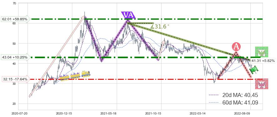 ♘ 支撑价格位32.15,可信任强度62.06%,距离最后交易2022-08-12形成的收盘价格39.04相差 -17.64%