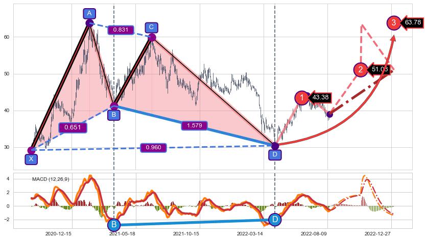 ➢ 谐波价格D点比B点低 ⤵,【MACD】指标D点比B点高 ⤴️