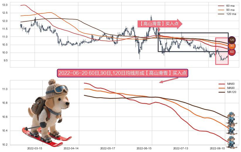 ⚀ 2022-04-19日-2022-08-12日显现 60日-90日-120日均线 【高山滑雪】买入点 看多信号,后市看涨,买入