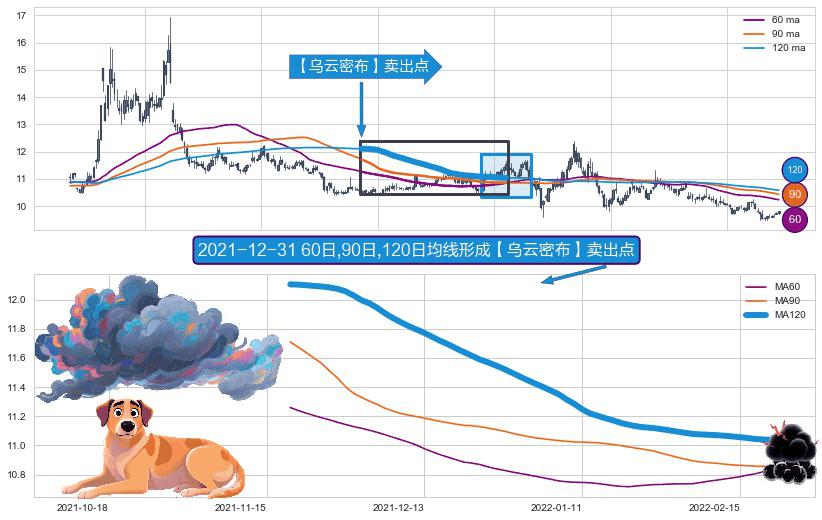 ⚀ 2021-11-18日-2022-02-22日显现 60日-90日-120日均线 【乌云密布】卖出点 看空信号,后市看跌,卖出