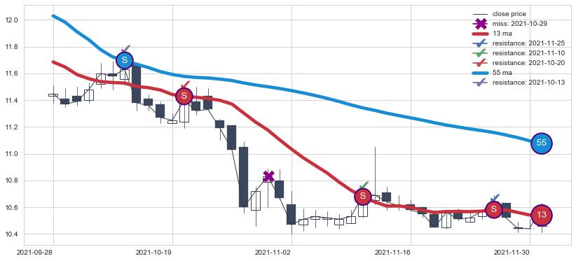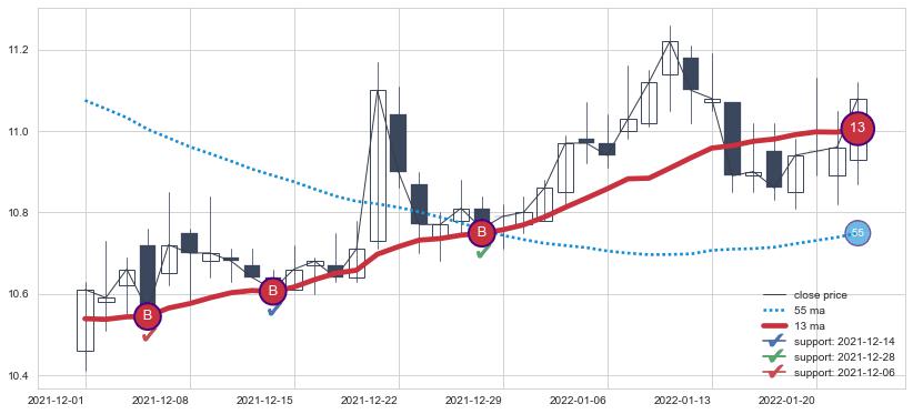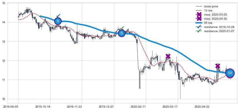 ➢ 最优均线组合共正确确认支撑阻力信号9处,正确确认率 69.23%